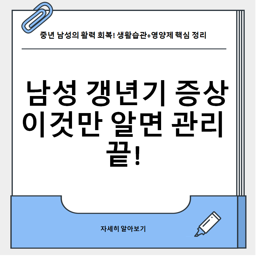 안녕하세요, 여러분. 어느 날 문득 거울 속 내 모습이 낯설게 느껴지고, 이유 없는 피로감과 짜증이 밀려온다면 주목해주세요. 대부분의 사람들이 중년 이후 여성만 갱년기를 겪는다고 생각하지만, 사실 남성도 예외는 아닙니다. 오늘은 **남성 갱년기 증상**을 중심으로 자가진단 방법부터, 실질적으로 도움이 되는 영양제 정보까지 정리해보았어요. 스스로를 돌보는 첫걸음, 지금부터 함께 시작해볼까요?