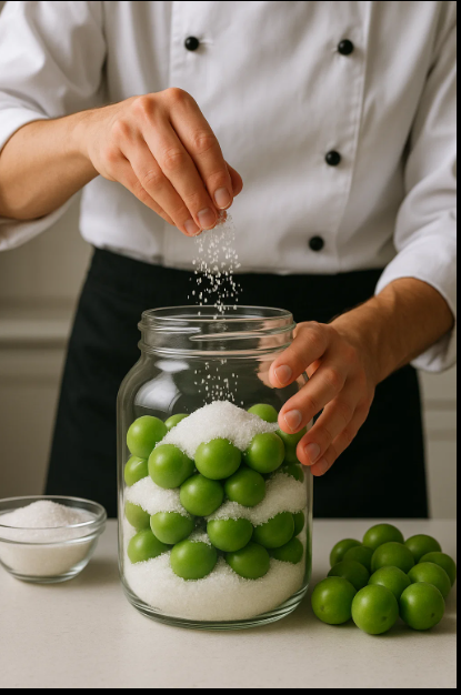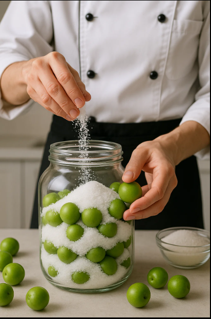 - 설탕과 섞기: 유리병에 매실과 설탕을 번갈아 담습니다. 위에는 반드시 설탕이 덮이도록 합니다.