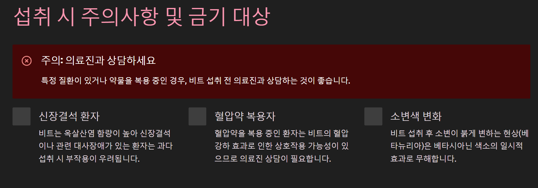 또한 혈압약을 복용 중인 분은 의료진과 상담 후 비트를 섭취하는 것이 좋습니다.