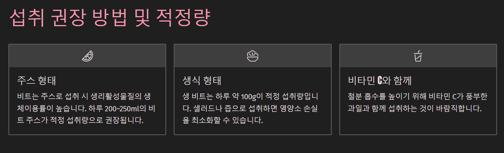- 비트 하루 섭취량: 비트 주스 기준 약 200~250ml