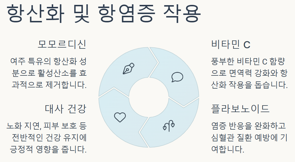 - 모모르디신: 항산화 및 항염 작용 또한 여주 효능의 한 축