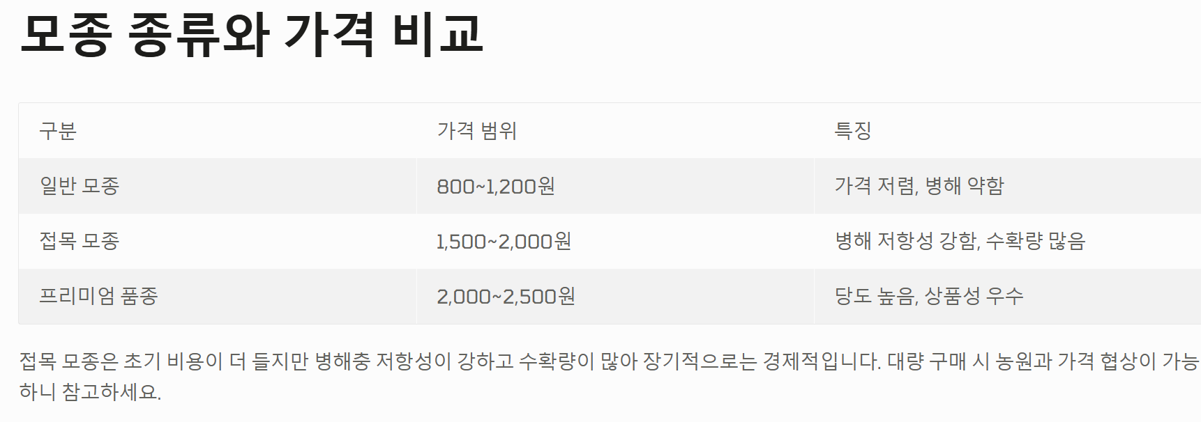 - 접목 모종: 1,500원 ~ 2,000원 (병해에 강한 편)