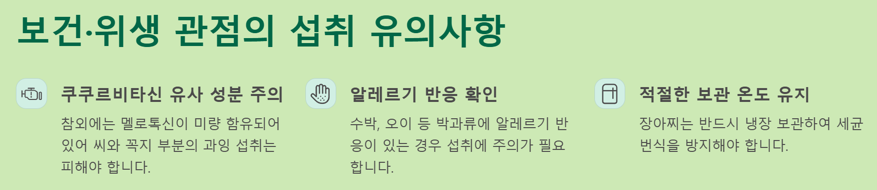 - 참외는 수박, 오이류 알레르기가 있는 분들께 반응을 일으킬 수 있습니다.