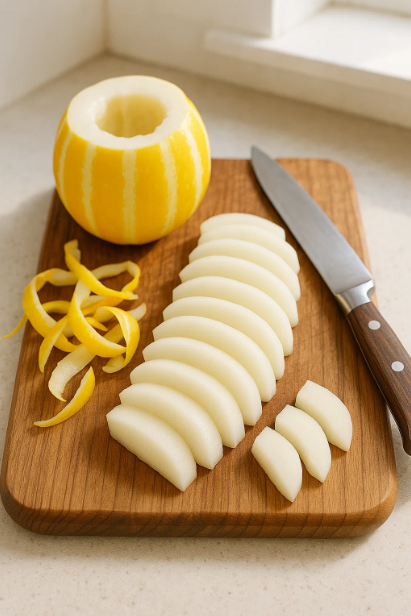 - 참외를 깨끗이 씻어 껍질과 씨를 제거한 뒤 썰어주세요.
