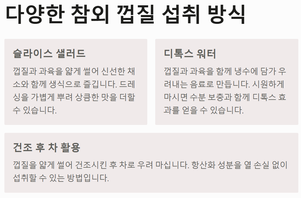 - 껍질 말려서 차로 활용: 햇볕에 말린 뒤 따뜻한 물에 우려내면 항산화차로도 좋아요.