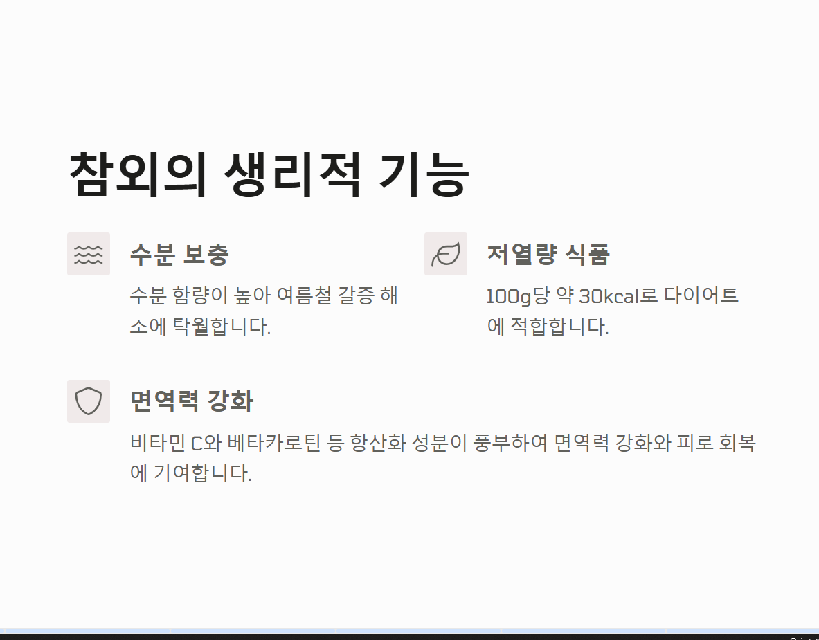 👉 참외 효능을 꾸준히 누리면 여름철 활력 넘치는 하루를 보낼 수 있습니다!